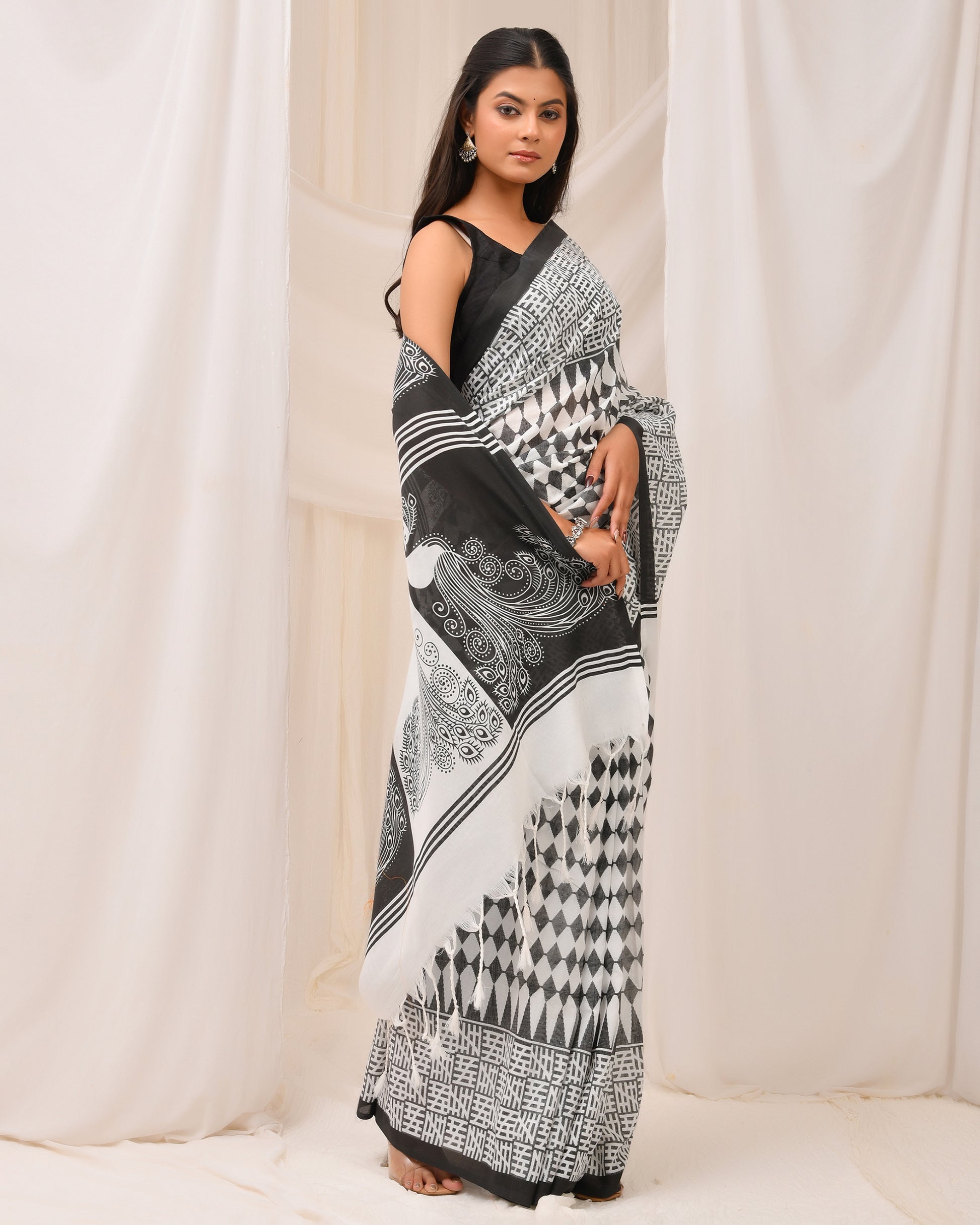 The 'Chhaya' Saree (meaning 'shadow' or 'shade') brings you a mesmerizing hand-painted cotton saree in a striking monochromatic black and white palette. The body features a bold, graphic diamond and geometric pattern, meticulously hand-painted, which transitions dramatically into a pallu adorned with elegant, large-scale peacock and paisley motifs, each stroke a testament to the artisan's skill. This saree is incredibly lightweight and crafted from soft, breathable handloom cotton.