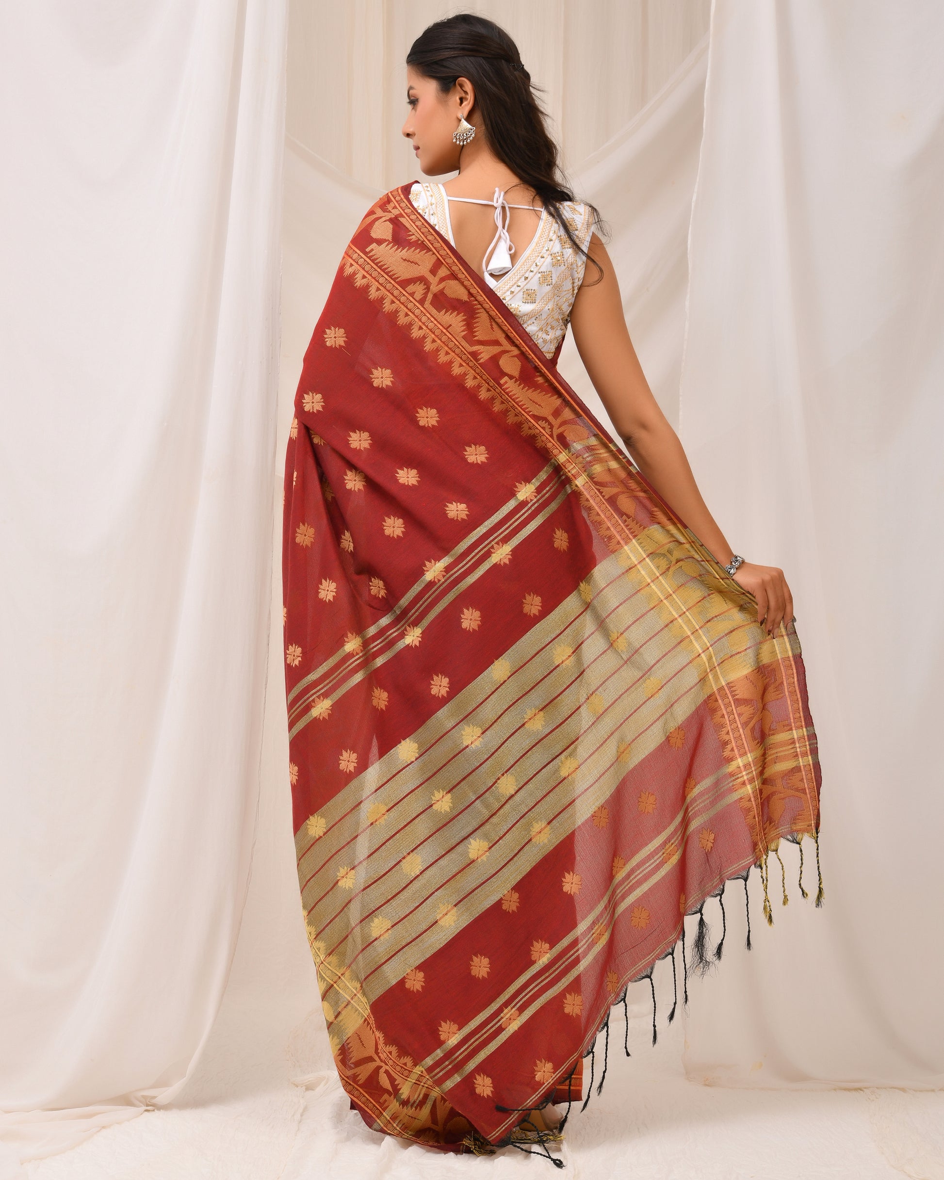 kurja brings a stunning example of a fine handloom cotton silk blend, ensuring a soft, luxurious drape with a subtle festive sheen. The body glows with a deep Crimson Red  richly adorned with delicate gold Zari floral buta (motifs) woven across the field. The saree’s main distinction is its magnificent pallu and border, featuring intricate, elaborate golden Jamdani motifs—Inspired by traditional patterns like hazar buti or panna hazar.